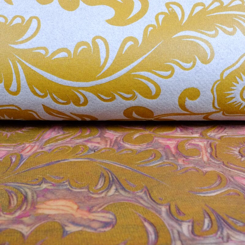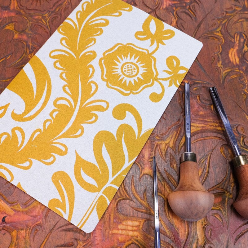 The design is based off of historical designs and prints from the 18th Century. Often repeating patterns, they could be used as wallpaper when tiled, or as endpapers in books. We hand-carved this pattern in a piece of cherry, and print them one by one. Click here to read more about the design and process.