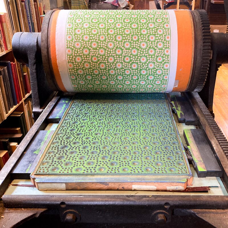 and designs like this were called Papiers Dominotés, or Domino Papers. France was an active producer of these patterned papers, which were used as end sheets in books, coverings for books, and wallpaper. Papers like this would be printed one at a time on a hand press on hand-carved wooden blocks. The block would have been inked with a thin paste-based ink, the paper laid on top, and the pressure applied would be from a barren or a muller. Our block printed papers use archival oil-based inks, and are placed in a press. Essentially the process is the same, with a few alterations. They are printed by hand, one color at a time.