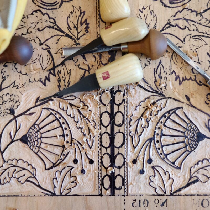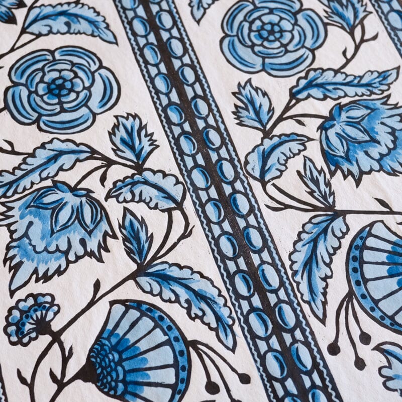These French Ribbons prints are printed from a hand-carved wooden block. Then, one by one, each are painted either in this monochromatic blue version or with 5 colors. They're based on antique French domino papers, or "papiers dominotés", which were used to cover the outside of books before binding. This one was influenced by a paper originally created in 1790, and may have also been used as a book endpaper, or wallpaper.