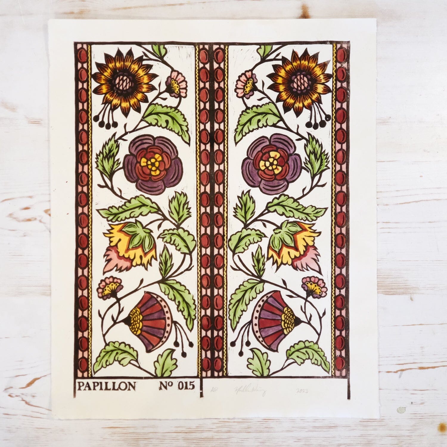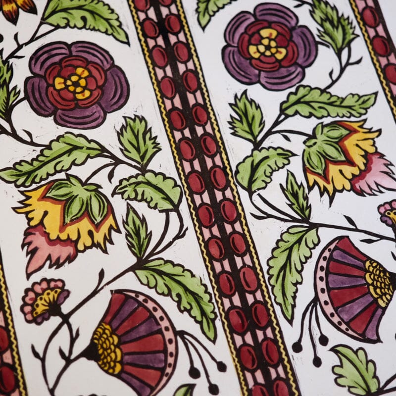 These French Ribbons prints are printed from a hand-carved wooden block. Then, one by one, each are painted either in this full color version, or in a monochromatic blue version. They're based on antique French domino papers, or "papiers dominotés", which were used to cover the outside of books before binding. This one was influenced by a paper originally created in 1790, and may have also been used as a book endpaper, or wallpaper.