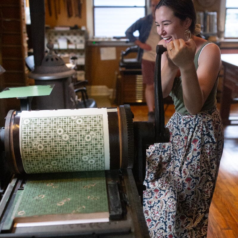 This pattern is based on a design we found covering an old Japanese chapbook from the early 1900s, featuring traditional ukiyo-e art and based on the history of Buddhism. We then created an expanded version large enough for a print, and hand-carved the pattern in a block of cherry wood.