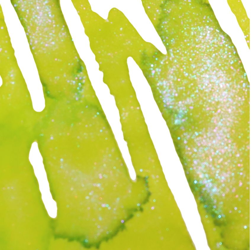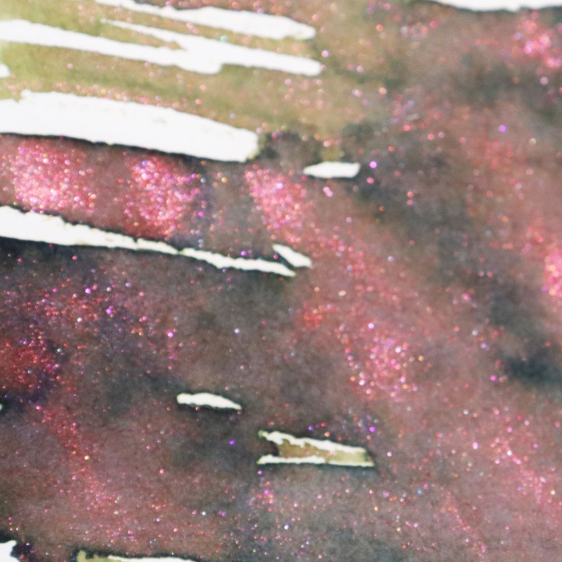 011 Autumn Forest: This ink is an olive green, with red shimmer, and black and gray sheening. When used in a pen, the color presents as olive green with red shimmer and tinges of dark gray at the edges.