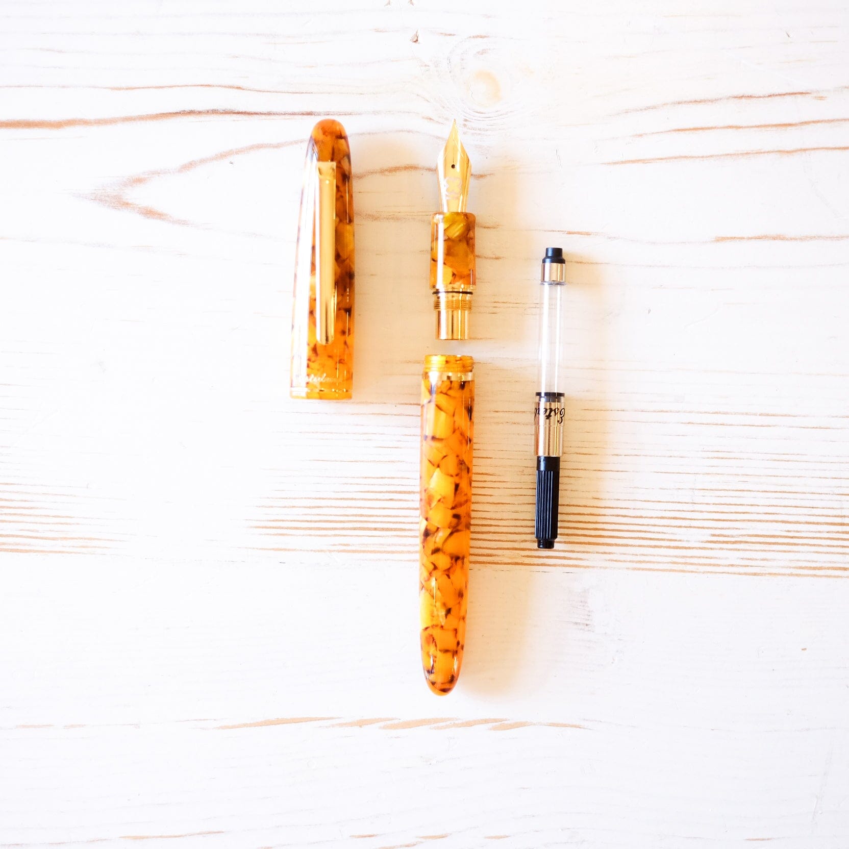 Featuring gold trim, the Honeycomb Estie is a timeless classic. The warm colors would be a lovely addition to any desk. Available in Fine or Medium Nib. Comes with a standard international converter.