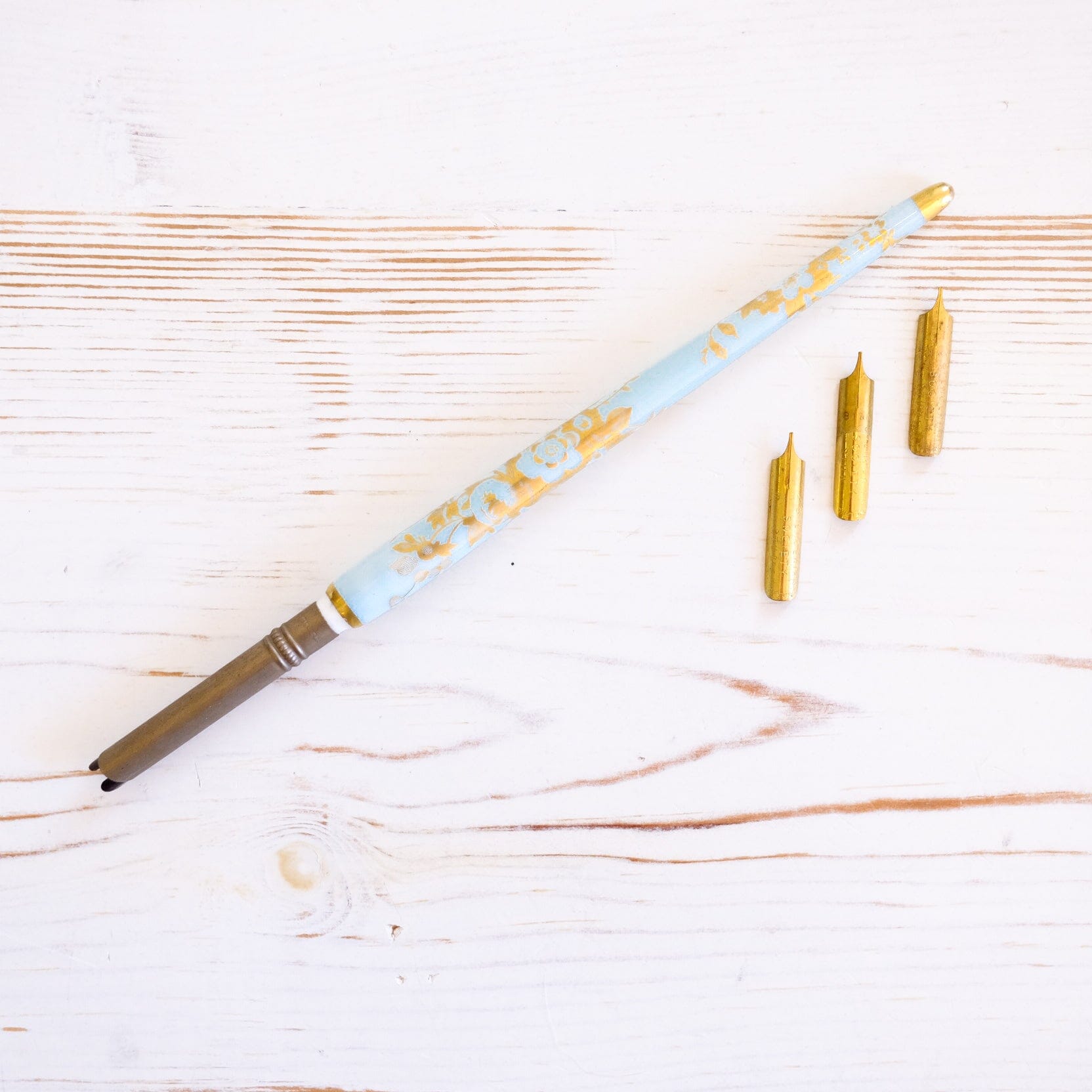 Set includes inkwell with tray, porcelain insert, tray with dip pen, and 3 antique dip pen nibs (untested).