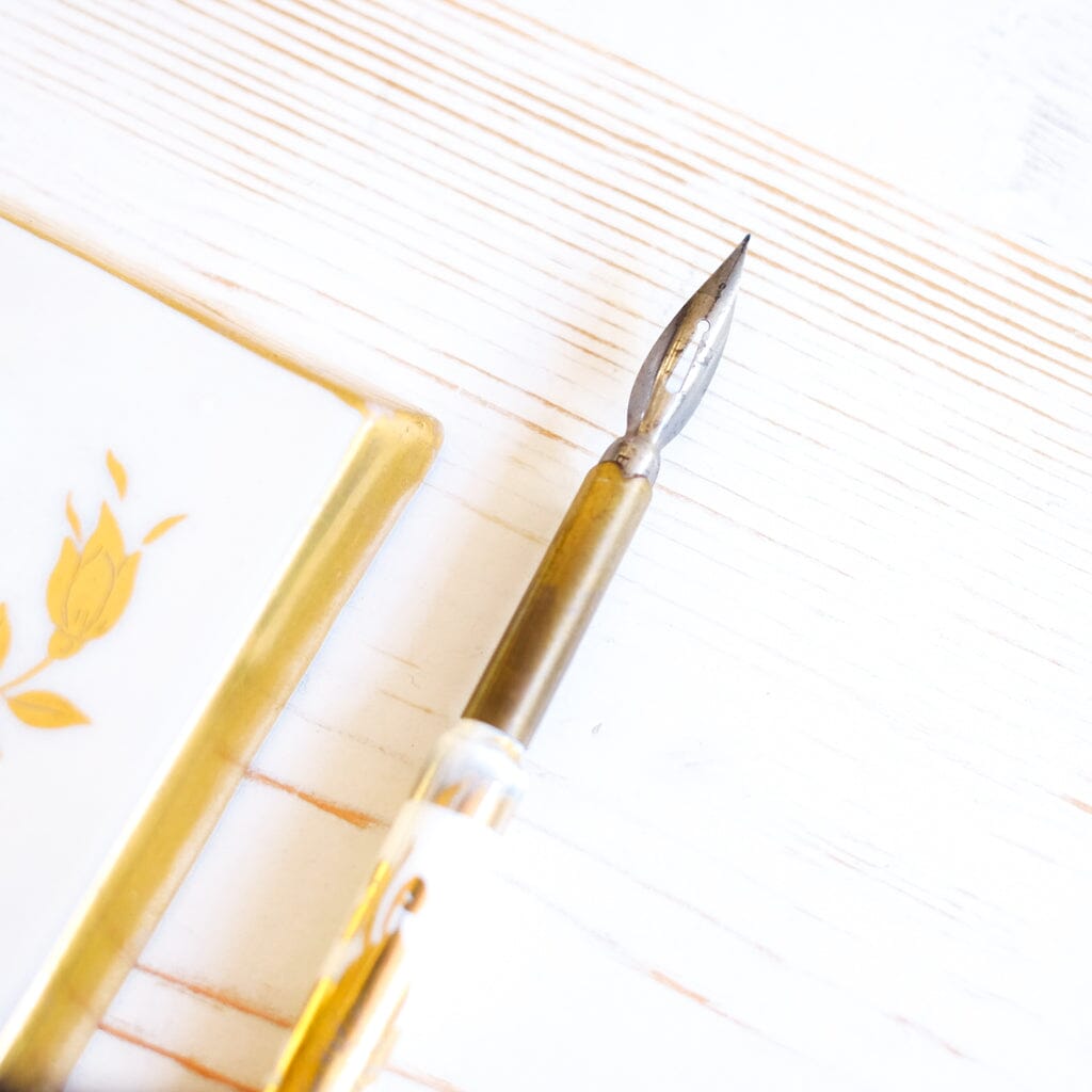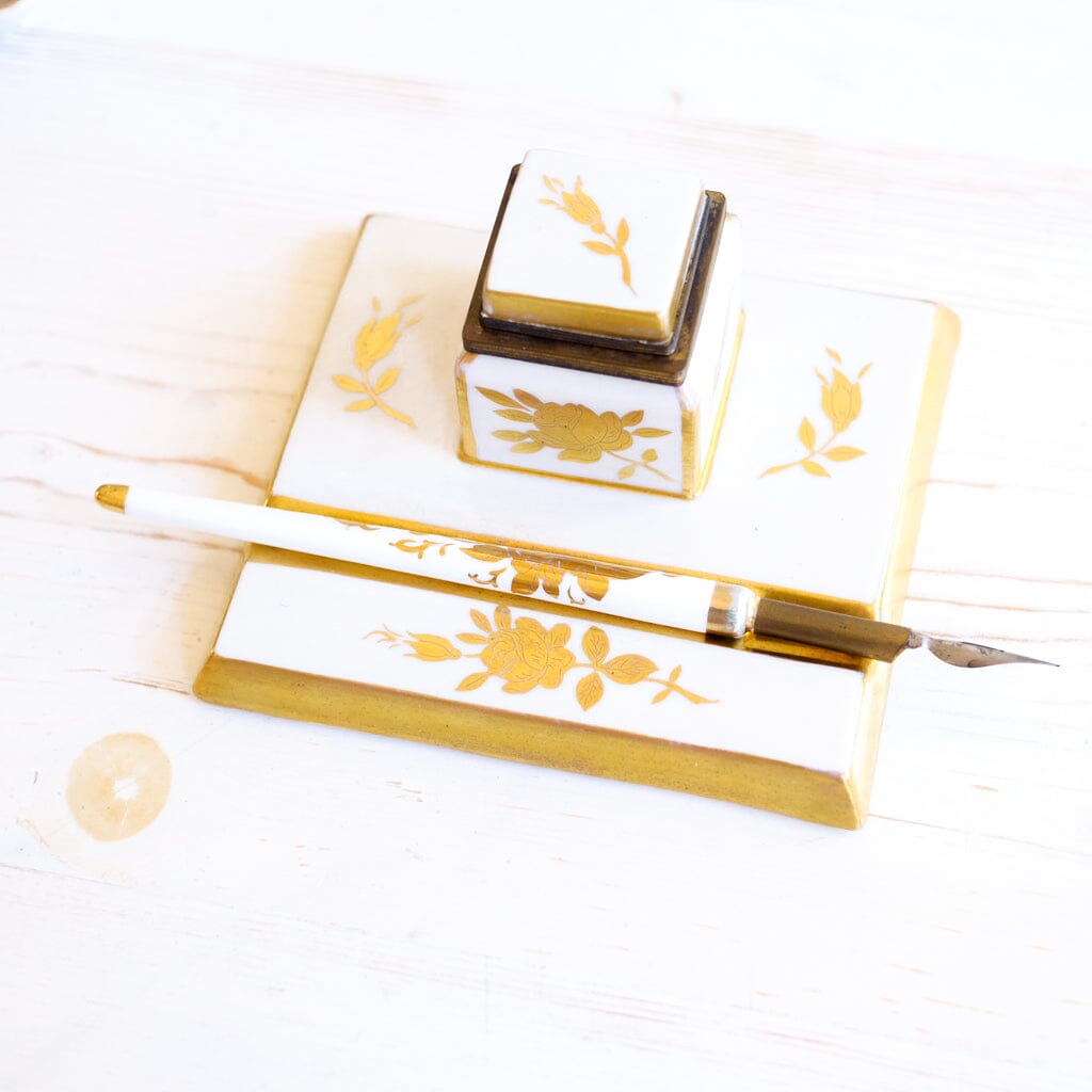 Set includes inkwell with pen rest, porcelain insert, dip pen, and 1 antique dip pen nibs (untested).