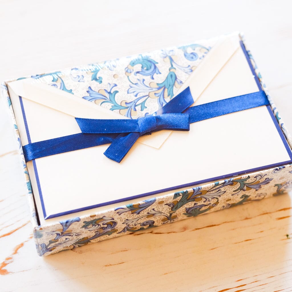 Boxed 10 navy bordered cards and 10 lined envelopes