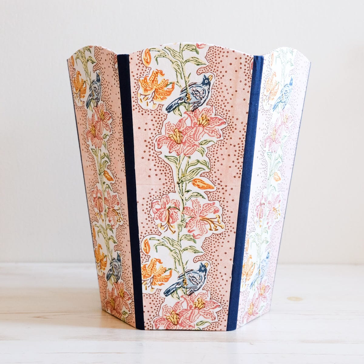 Wastebasket, made of paper and fabric. Hand-block printed in India.