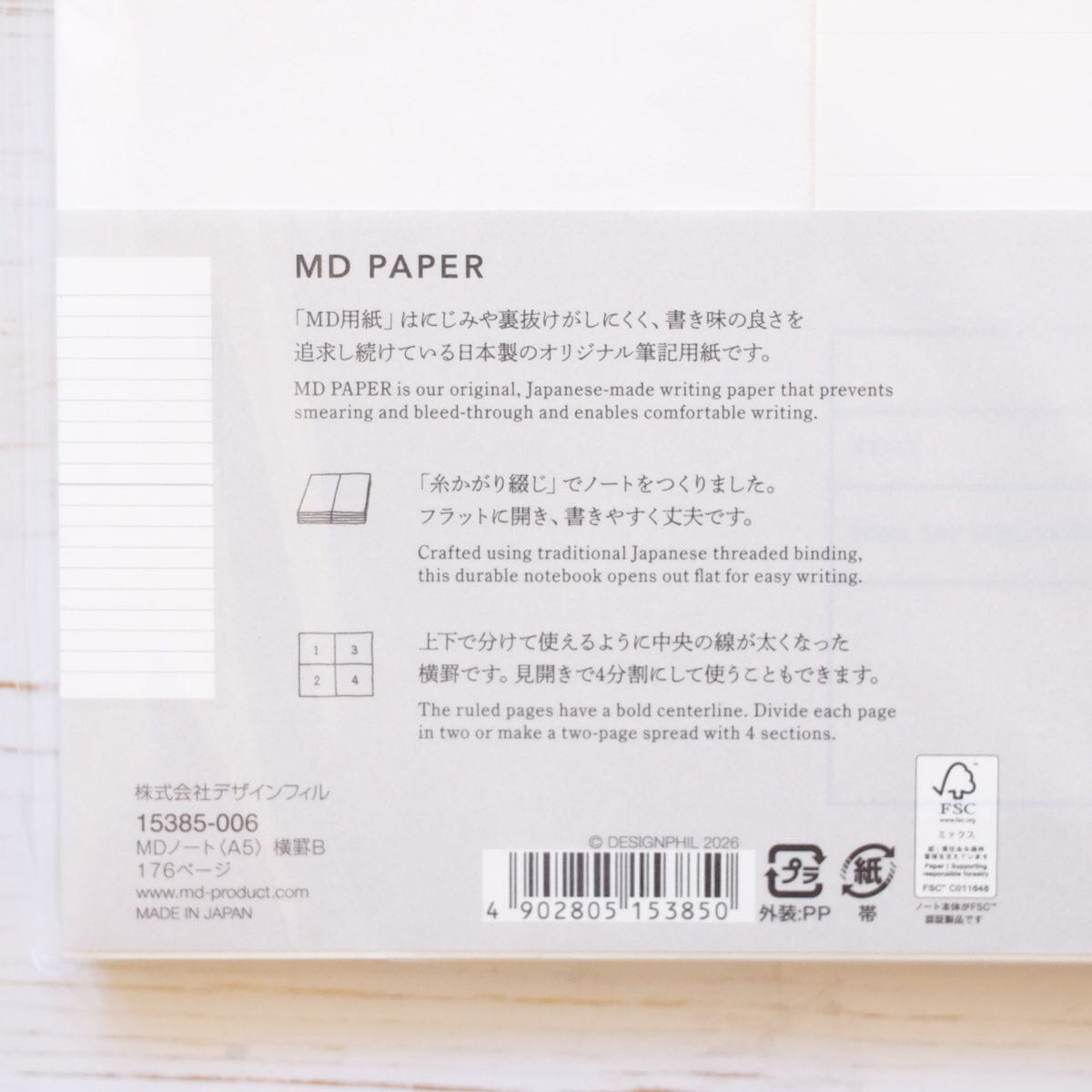It features a binding that opens 180 degrees flat and a pursuit of functional beauty without ornamentation. It uses our original writing paper, "MD PAPER," which we have been developing in-house since the 1960s, focusing on quality that prevents bleed-through and feathering, even when writing with a fountain pen.