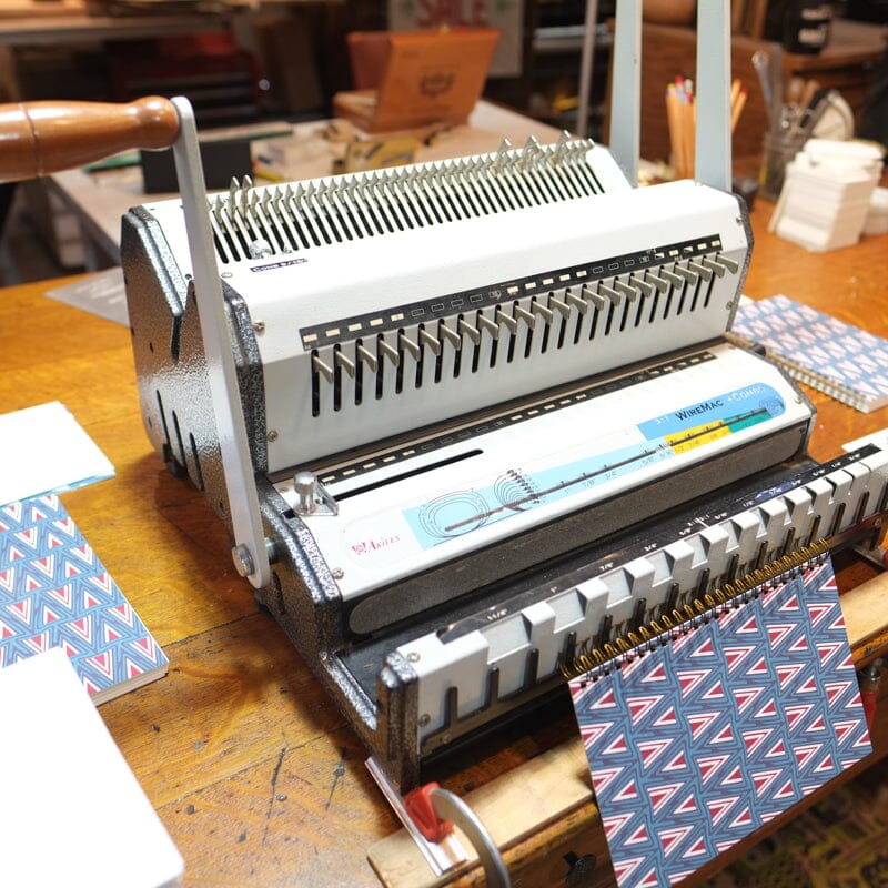 These notebooks are letterpress printed using our Chandler & Price printing press from 1922. Each notebook requires three separate printing processes, one for each of the three ink colors.