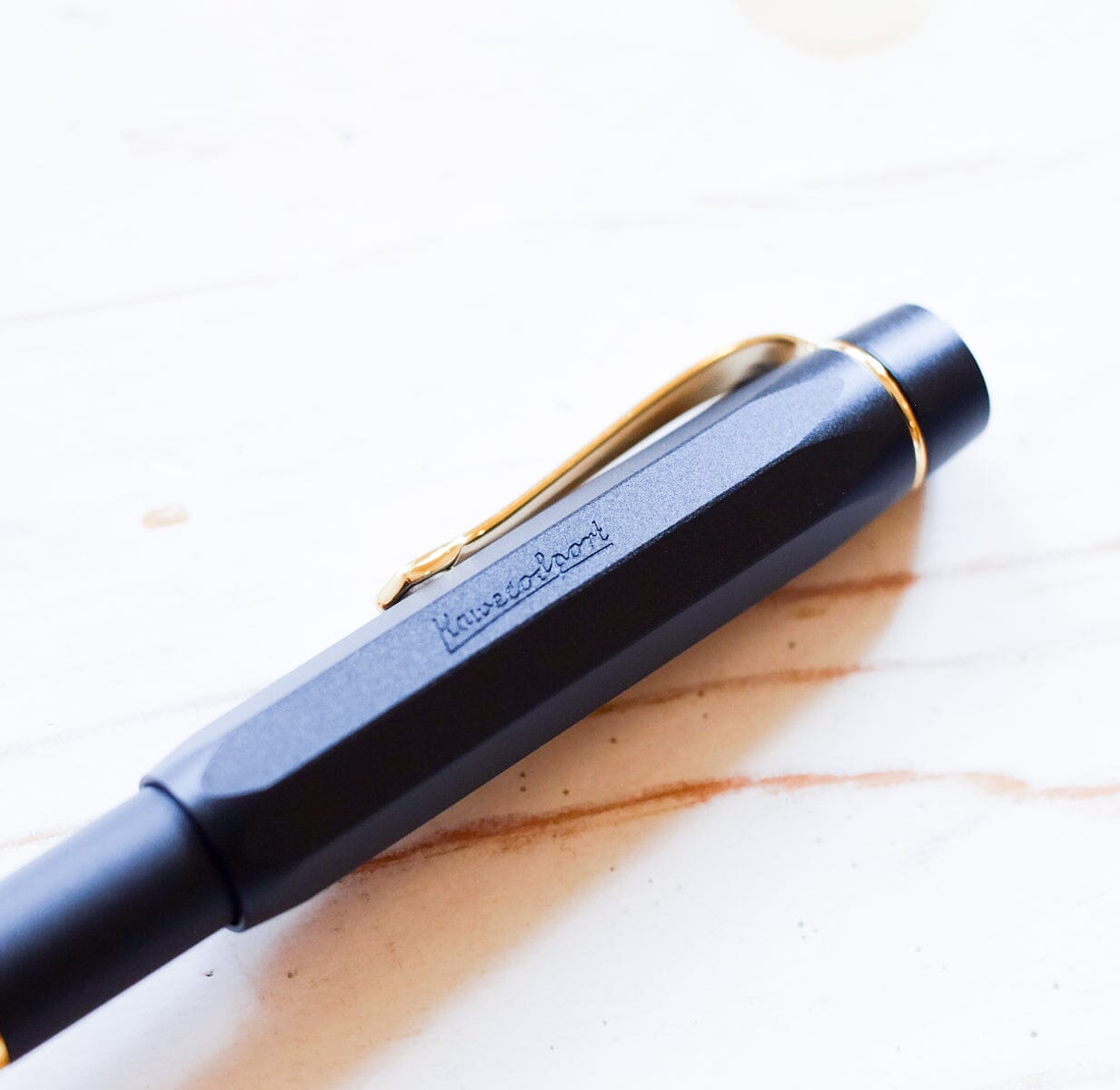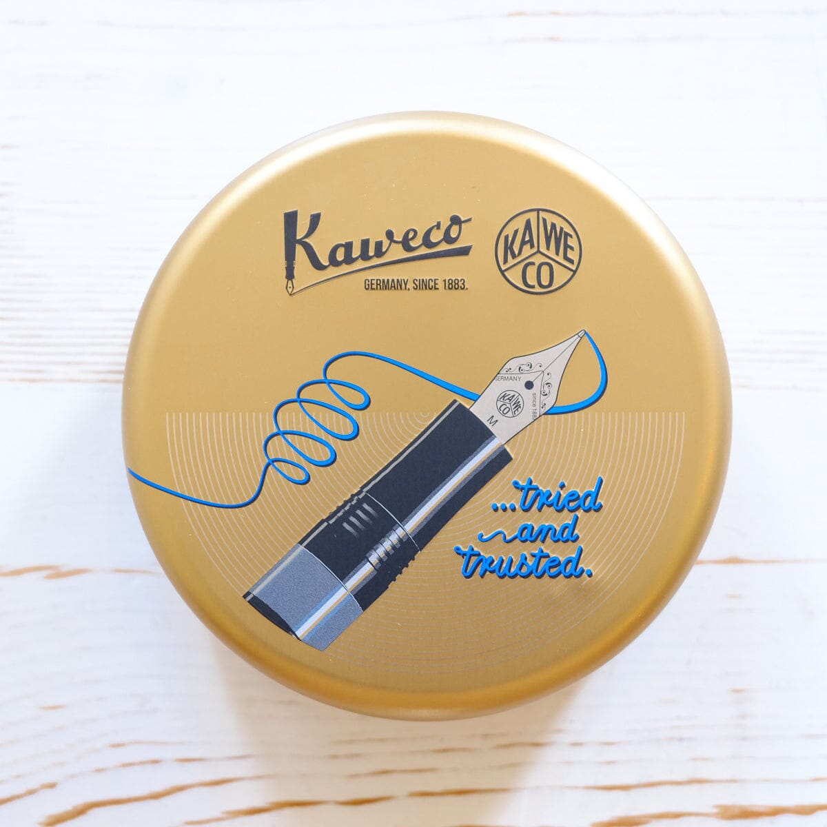 This starter set includes one of the 2024 Kaweco Piston Fountain Pens, which features a Fine steel nib and a heavy aluminum body. The pen fills directly from the bottle of ink included (32 ml of Kaweco's Royal Blue ink), or any other bottle you may like to use.