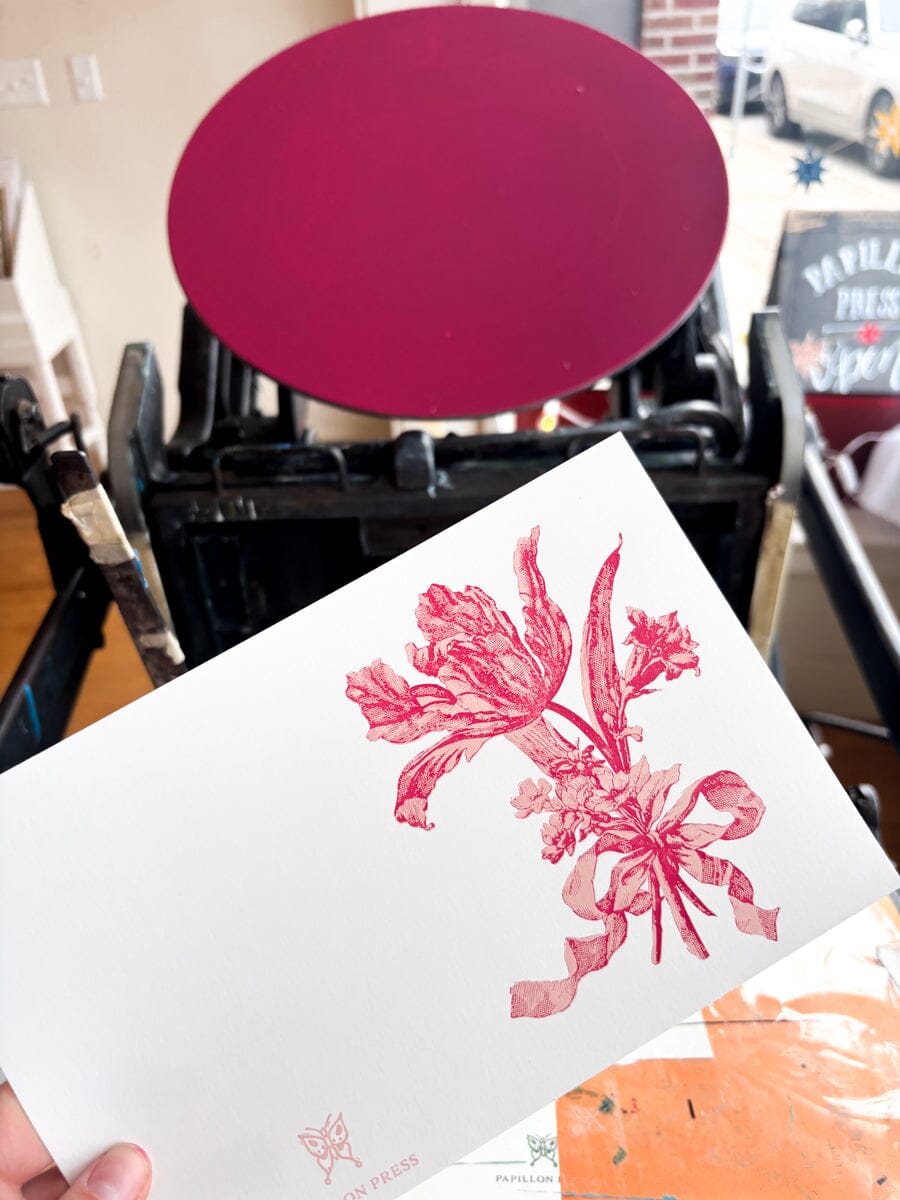 These two-color Tulip bouquet cards are letterpress printed on 100% cotton paper, and printed with vegetable based inks. For more info on our materials, click here.