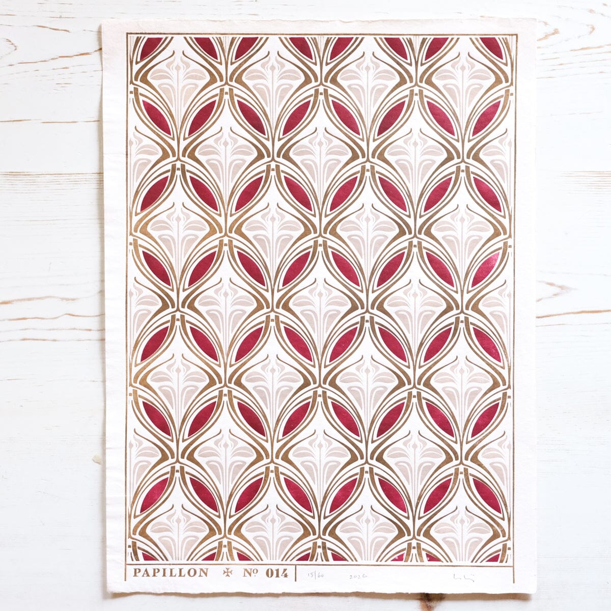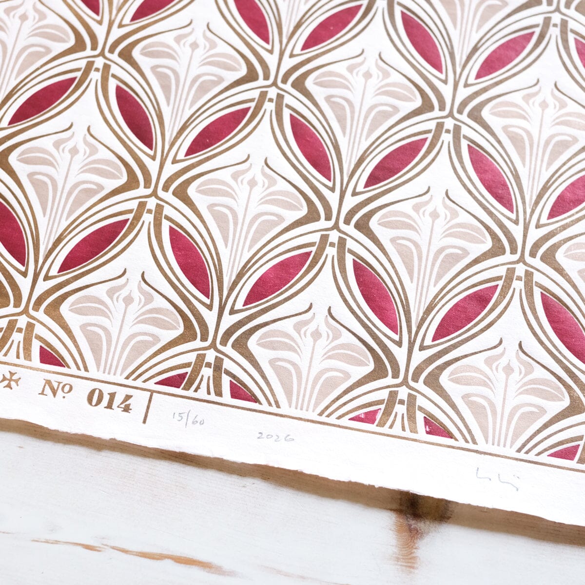 This is a 3 color print, based early 1900s Dutch endpapers, which contrast greatly with the Victorian style which tends to be more common during this era. Each color requires its own plate and printing process. We've also dyed the paper by hand to highlight the other colors in the print.